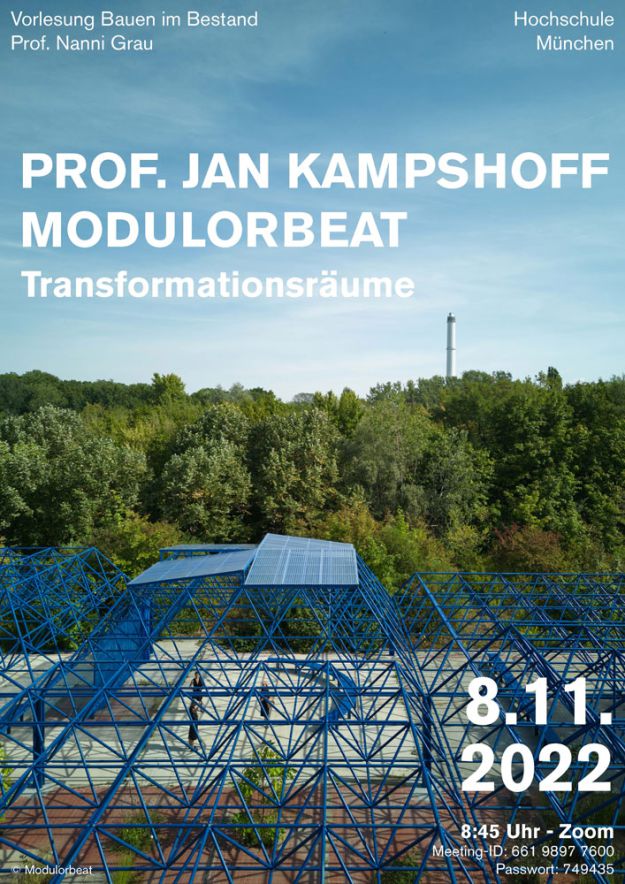 Lectures Transformationsräume Online-Vorlesung an der Hochschule München am Fachgebiet "Bauen im Bestand" von Prof. Nanni Grau. Ort Hochschule München Link www.ar.hm.edu Datum 08.11.2022