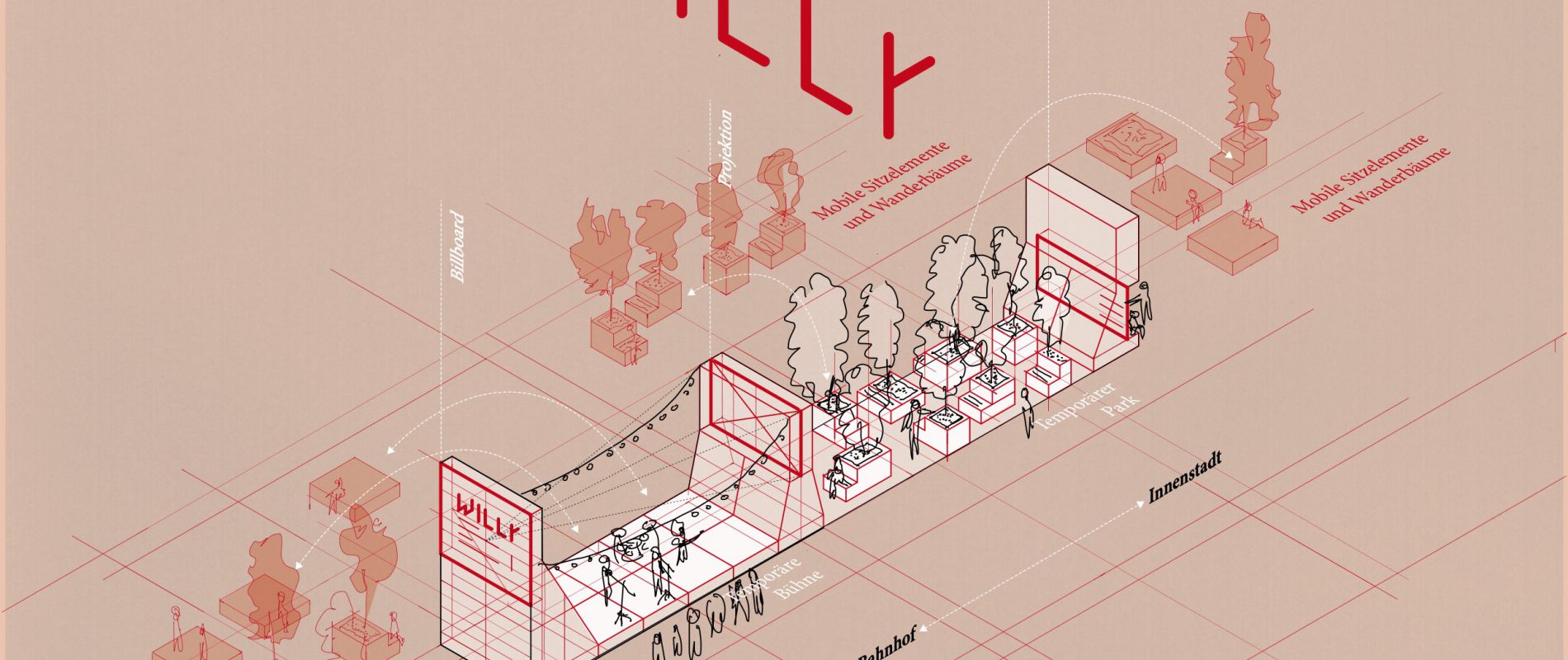 Rot Weiss Willy ist eine temporäre Partizipations-Architektur aus festen und beweglichen Elementen auf dem Willy-Brandt-Platz. Ziel der Reallabors ist die Erprobung unterschiedlicher räumlicher und funktionaler Konfigurationen. Das bestehende und erweiterte Platz-Raster wird dafür abzüglich der vorgegebenen Tabuzonen als Spielfeld für eine experimentelle Platzgestaltung in drei Akten verstanden.