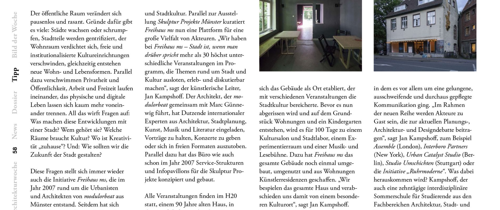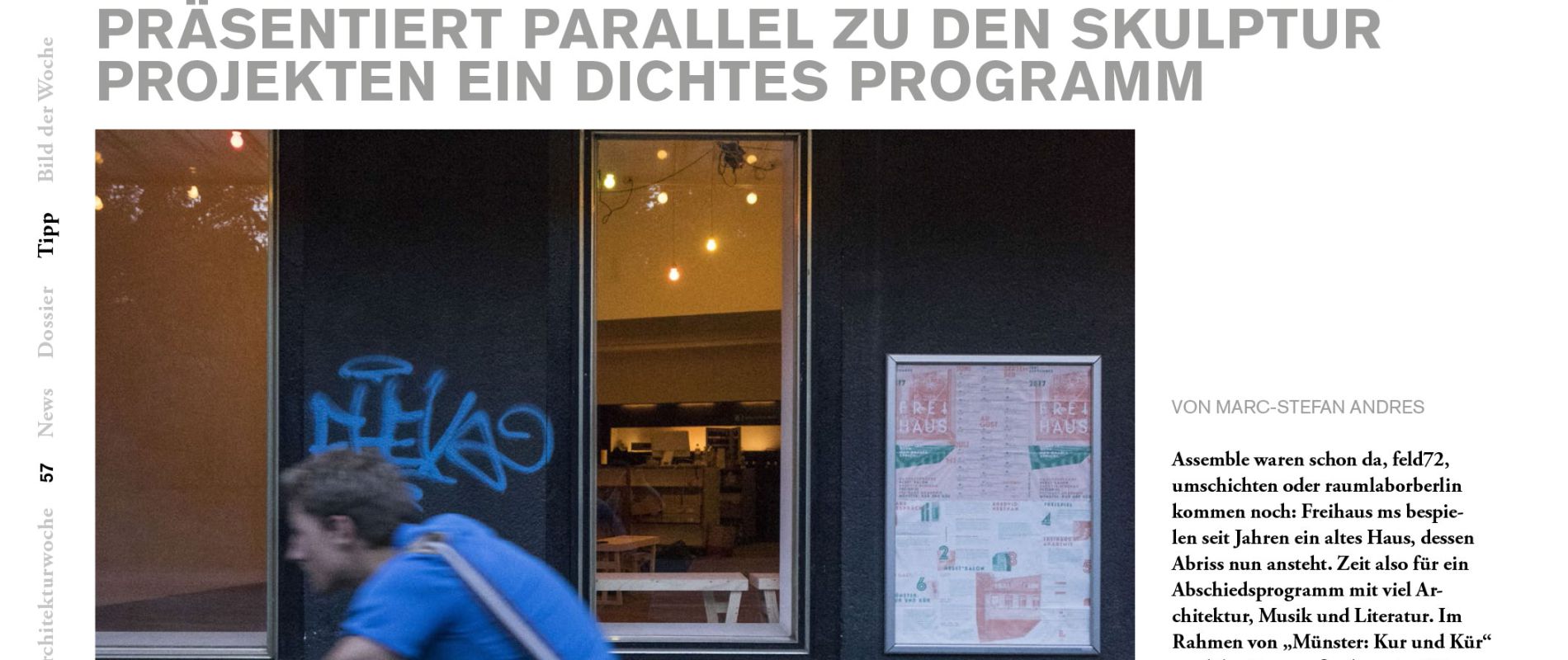 Publications Baunetz Woche Kunst und Stadt Freihaus Projekt-Portrait in der Baunetz Woche von Marc-Stefan Andres.