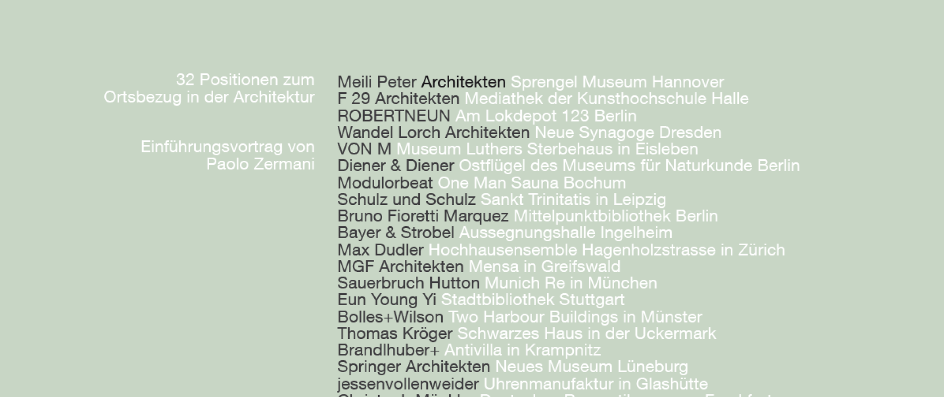 "Gleich einer Inventur hinterfragt und erforscht die Tagung zur „Identität der Architektur“ den gegenwärtigen Bestand der Disziplin. Gemeint ist der Bestand an verbindlichen Grundlagen, Techniken, Prinzipien, Methoden, Begriffen, Referenzen und Vorstellungen, die Entwurf und Bau von Architektur und Stadt betreffen. Mit der Feststellung des Inventars verfolgt die Tagung das Ziel, die Beiträge zur „inneren“ Bestimmung der Disziplin für den Diskurs über Architektur und als Publikationsvorhaben für Praxis, Lehre und Forschung bereitzustellen und so eine anschauliche Annährung an die Komplexität der Profession zu leisten.Die erste Tagung thematisiert den Ort als eine der grundsätzlichen Einflussgrößen beim Entwurf und Bau von Architektur und Stadt. Gebaute Architektur ist immer an einen realen Ort gebunden. Durch die Eigenheiten des Ortes erfolgt die Individualisierung der Aufgabe, entsteht die Besonderheit die nur im Dialog und in Bezugnahme auf den physischen Kontext erschlossen werden kann. Die Auseinandersetzung mit dem Umfeld erfordert beides, die Wertschätzung des Vorhandenen als auch das Bewusstsein, dass Architektur die gesellschaftlichen Voraussetzungen und technischen Möglichkeiten ihrer Zeit spiegelt und somit immer auch Veränderung bedeutet.Unter dem Thema „Ort“ geht die Konferenz dieser Frage nach dem Ortsbezug der Architektur und seiner möglichen Verankerung innerhalb der Disziplin nach. Wie kann man den Ort verstehen und seinen Anspruch, den er an die Architektur stellt; wie kann die Architektur auf den Ort reagieren?"