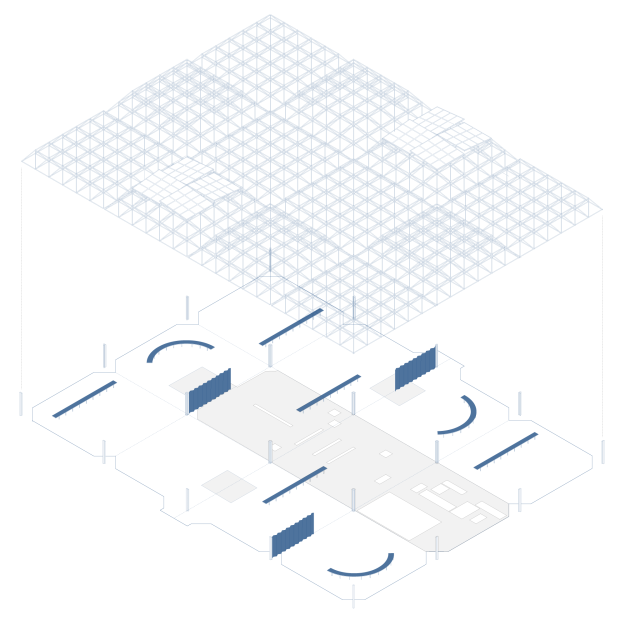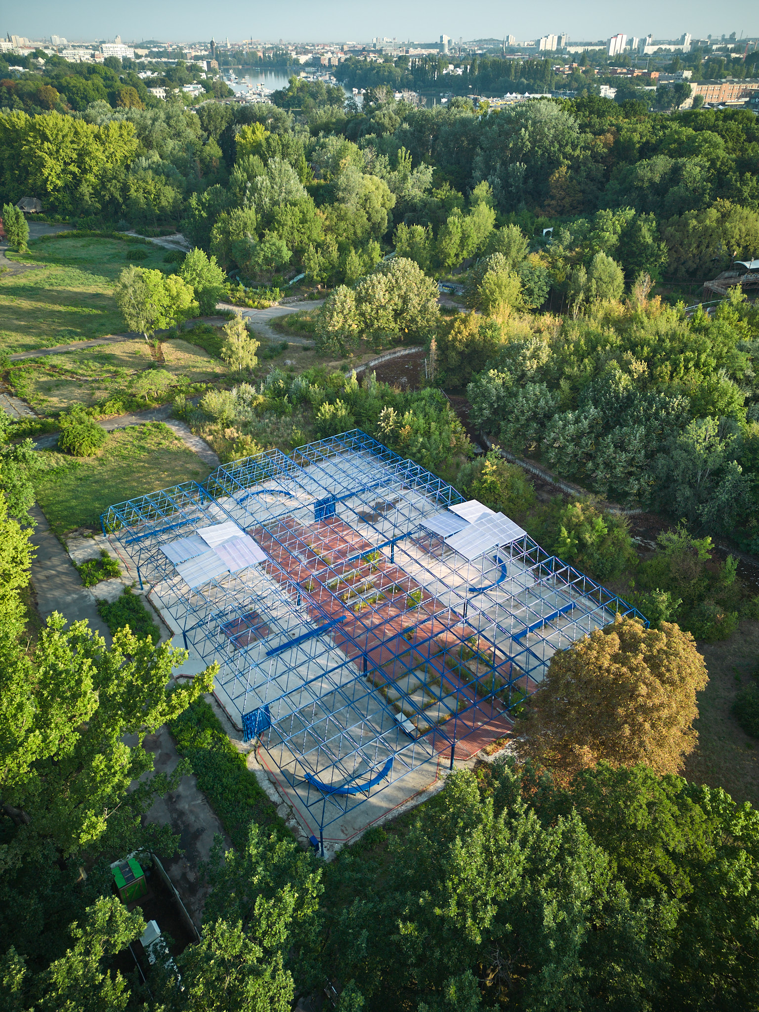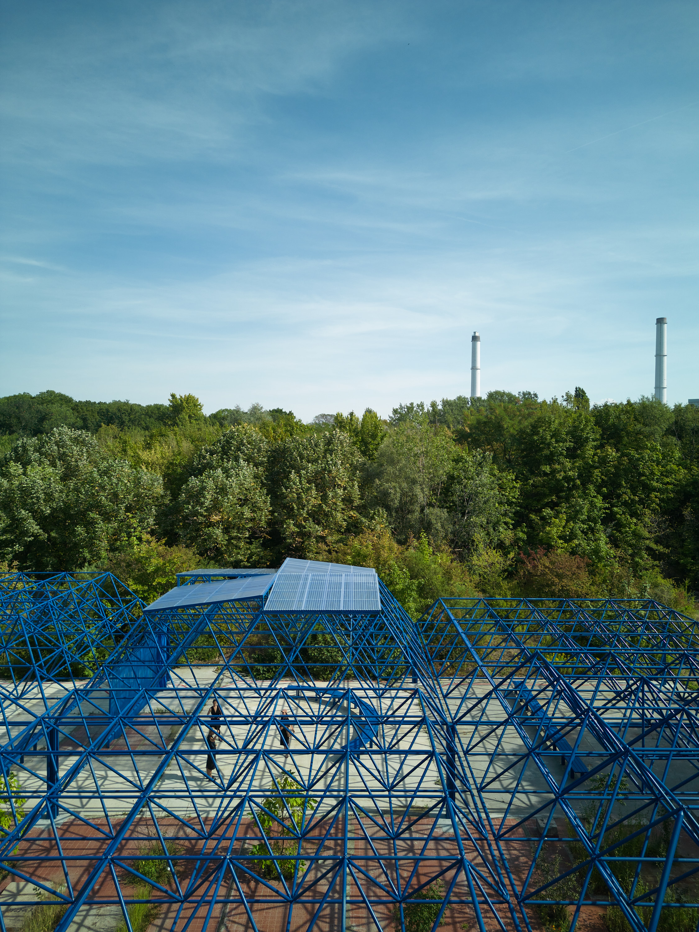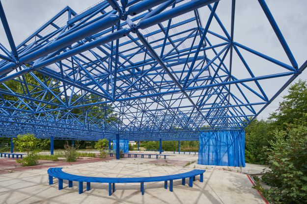 Der Entwurf nutzt den Bestand der Mero-Halle als Ausgangspunkt und Ressource für die Entwicklung eines neuen hybriden Ortes. Die bestehende Tragwerkskonstruktion mit den namengebenden MERO-Knoten wurde im Rahmen der Sicherungsmaßnahmen des Parks ertüchtigt und durch einen blauen Korrosionsschutz ergänzt: Ein leuchtendes Enzianblau, das als Farbe in der Natur kaum vorkommt. Die Struktur des Daches und seine Schattenwürfe wurden für die Transformation der Halle aufgegriffen und sind in den Elementen der Installation wieder zu finden. Bänke laden zum Verweilen, zum Zuschauen und -hören ein. Teilüberdachungen schützen vor Regen oder Hitze, verändern aber auch den Blick in den Himmel und spielen mit Licht und Schatten. Die Vorhangelemente, die wie ein Interieur einzelne Sektionen innerhalb der Halle bilden, thematisieren indes die Grenze zwischen Innen und Außen. Vorhandene Schächte und Perforationen in der bestehenden Bodenplatte nehmen Planzen auf und bilden einen Hybrid zwischen Struktur und Natur. Diese Interventionen schaffen einen räumlichen Rahmen, der unterschiedliche Programmnutzungen zulässt und im Dialog von Raum und Nutzung steht. Die „Blaue Stunde“ ist ein Potentialraum, der als Gastgeber fungiert und neue Formate der Begegnung ermöglicht. Die zunächst temporäre Installation wird nun nach einem erfolgreichen Testbetrieb zum dauerhaften Teil des neuen Spreeparks..