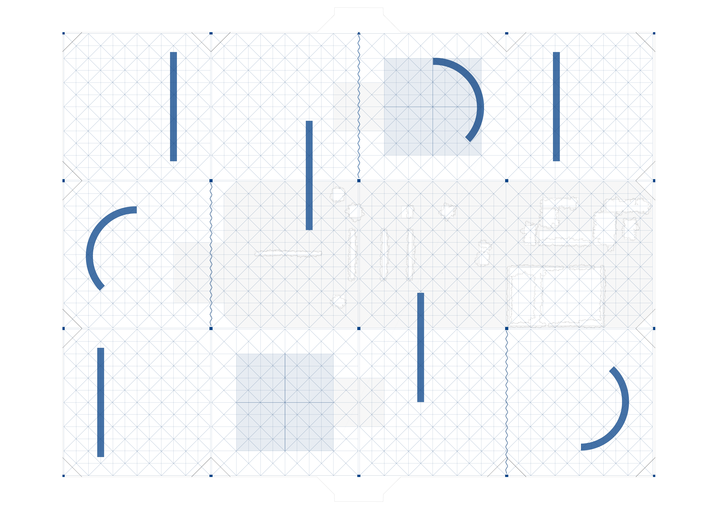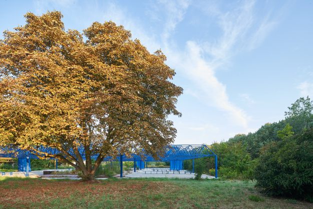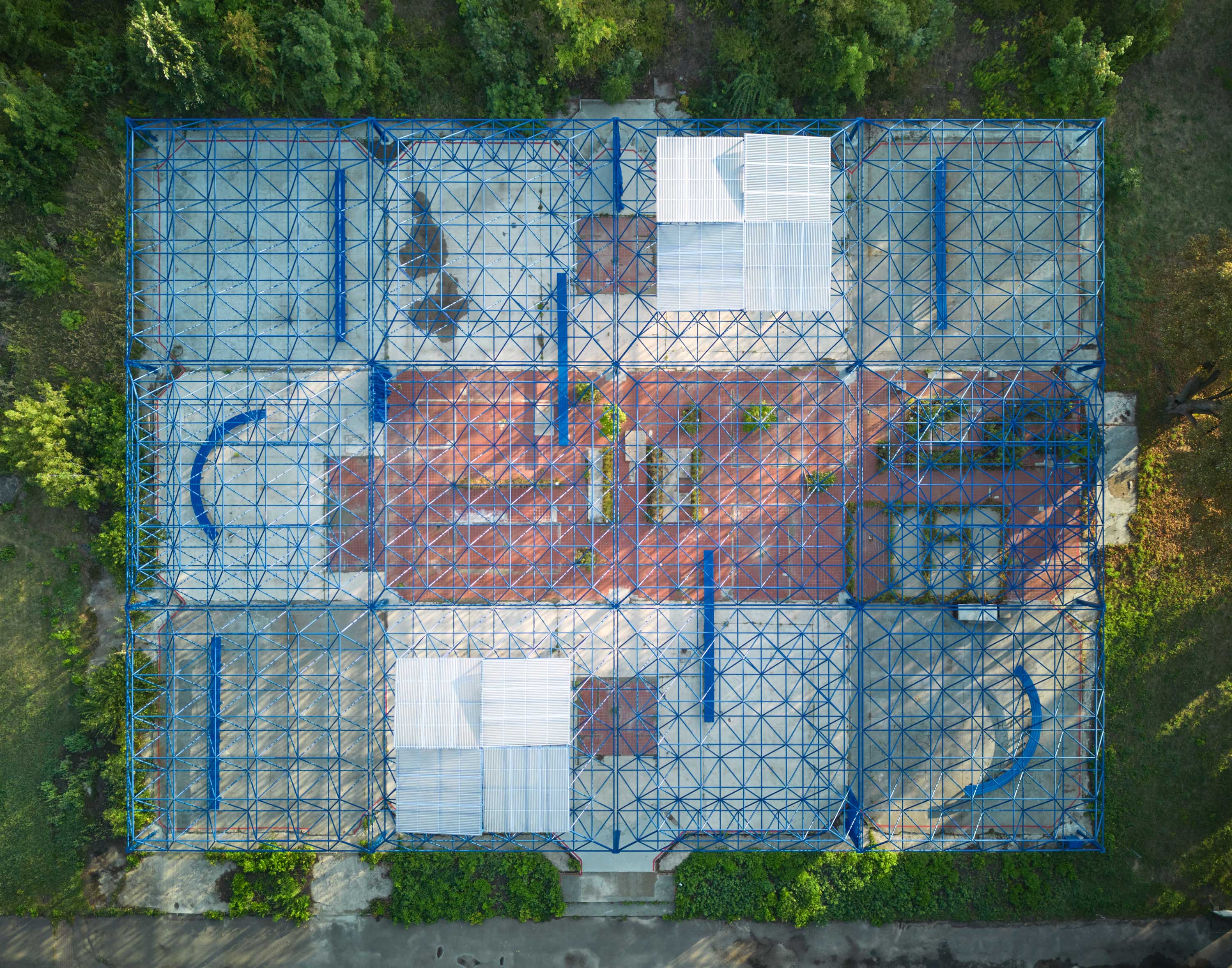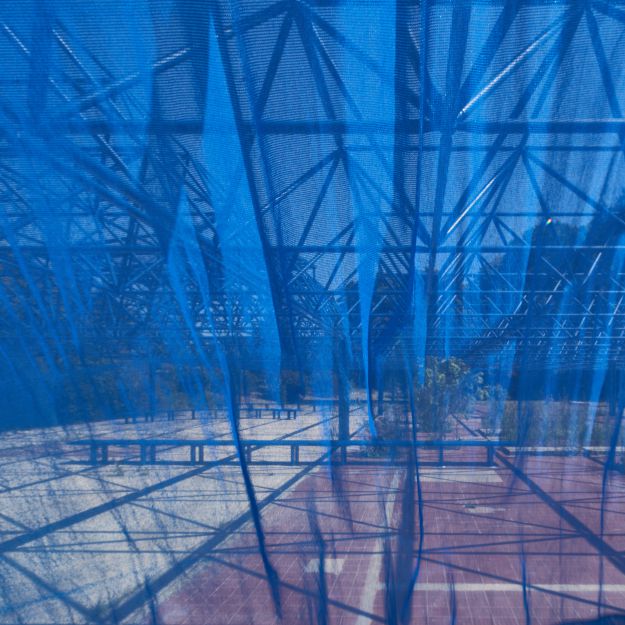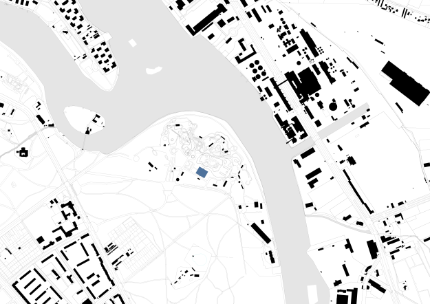 Der Entwurf nutzt den Bestand der Mero-Halle als Ausgangspunkt und Ressource für die Entwicklung eines neuen hybriden Ortes. Die bestehende Tragwerkskonstruktion mit den namengebenden MERO-Knoten wurde im Rahmen der Sicherungsmaßnahmen des Parks ertüchtigt und durch einen blauen Korrosionsschutz ergänzt: Ein leuchtendes Enzianblau, das als Farbe in der Natur kaum vorkommt. Die Struktur des Daches und seine Schattenwürfe wurden für die Transformation der Halle aufgegriffen und sind in den Elementen der Installation wieder zu finden. Bänke laden zum Verweilen, zum Zuschauen und -hören ein. Teilüberdachungen schützen vor Regen oder Hitze, verändern aber auch den Blick in den Himmel und spielen mit Licht und Schatten. Die Vorhangelemente, die wie ein Interieur einzelne Sektionen innerhalb der Halle bilden, thematisieren indes die Grenze zwischen Innen und Außen. Vorhandene Schächte und Perforationen in der bestehenden Bodenplatte nehmen Planzen auf und bilden einen Hybrid zwischen Struktur und Natur. Diese Interventionen schaffen einen räumlichen Rahmen, der unterschiedliche Programmnutzungen zulässt und im Dialog von Raum und Nutzung steht. Die „Blaue Stunde“ ist ein Potentialraum, der als Gastgeber fungiert und neue Formate der Begegnung ermöglicht. Die zunächst temporäre Installation wird nun nach einem erfolgreichen Testbetrieb zum dauerhaften Teil des neuen Spreeparks..