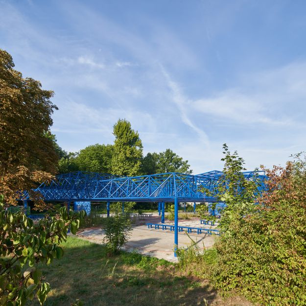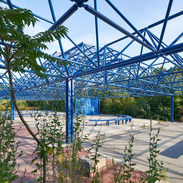 Der Spreepark Berlin hat eine wechselvolle Geschichte hinter sich und wird in den kommenden Jahren als grüner Freiraum für alle Bürger*innen zurückkehren. Ursprünglich als einziger Freizeitpark der DDR im Norden des Plänterwaldes eröffnet, wurde er nach der politischen Wende umgestaltet und lag nach der Insolvenz des Betreibers Jahrzehnte lang brach. Im Rahmen einer künstlerischen Forschung wurde modulorbeat beauftragt, die Potentiale des ehemaligen Schnellrestaurants und Vergnügungsorts des Spreeparks, der Mero-Halle, herauszuarbeiten. Dabei diente die „Blaue Stunde“ als Metapher für die Transformation und Veränderung. Die „Blaue Stunde“ bezieht sich auf die abendliche oder morgendliche Dämmerung, in der sich die Wahrnehmung der Umgebung durch die natürliche Lichtsituation verschiebt. Der Übergang von Tag zu Nacht und Nacht zu Tag entspricht dem Entwicklungsübergang zwischen dem deaktivierten Park und der zukünftigen öffentlichen Nutzung.