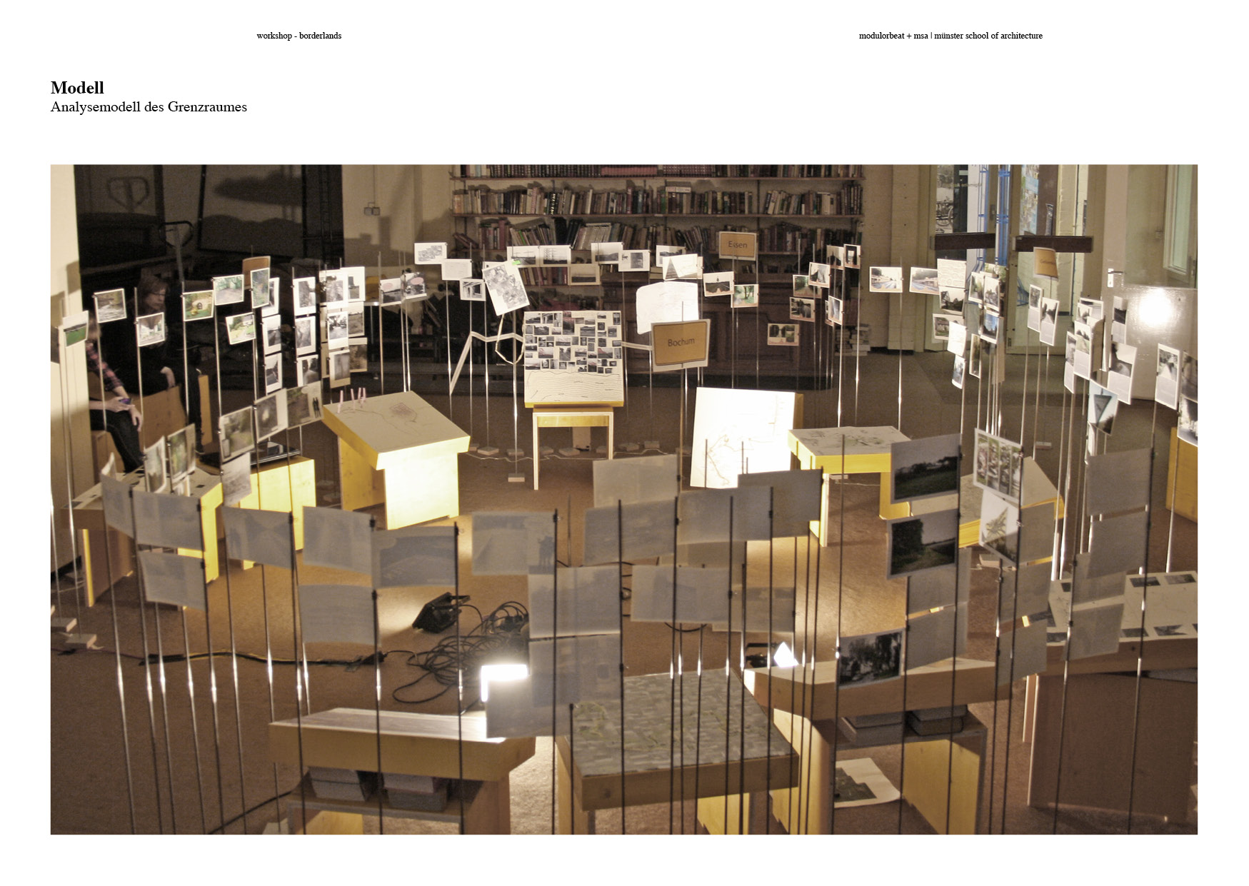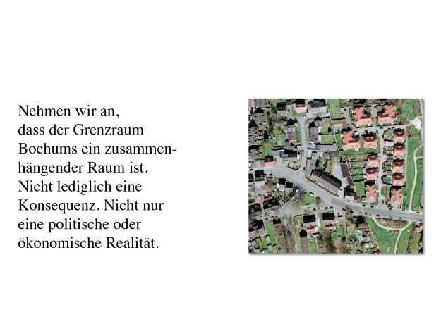 Das Rechercheprojekt "Borderlands" setzt sich mit den Grenz- und Übergangsräumen der Stadt Bochum als ein Teil des urbanen Systems "Ruhrgebiet" auseinander. Die Arbeit im Labor gliederte sich im wesentlichen in zwei Phasen: Eine erste Workshopphase, bei der gemeinsam mit Studierenden der münster school of architecture mittels verschiedener Methoden der Begehung und Kartierung spezifische Eigenschaften dieser Räume entdeckt und beschrieben wurden, leitete das Labor ein. In einer zweiten Reflexionsphase wurden diese Entdeckungen in einen thematischen Kontext gestellt und hinterfragt. Diese Reflexion soll im Anschluß an die Recherche als Ausgangspunkt für ein künstlerisch und architektonisches Projekt im Stadtraum Bochum dienen.