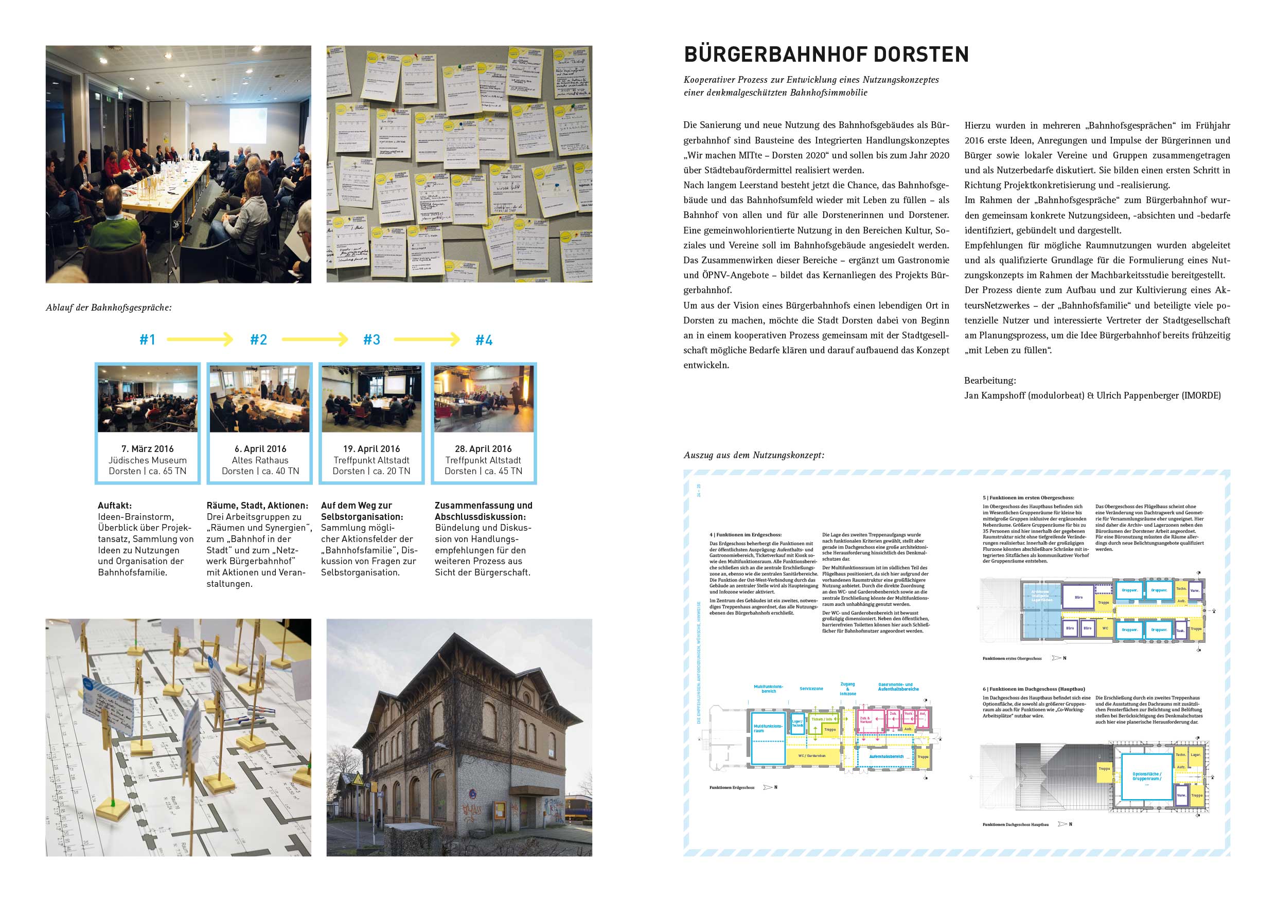 Hierzu wurden in mehreren „Bahnhofsgesprächen“ im Frühjahr 2016 erste Ideen, Anregungen und Impulse der Bürgerinnen und Bürger sowie lokaler Vereine und Gruppen zusammengetragen und als Nutzerbedarfe diskutiert. Sie bilden einen ersten Schritt in Richtung Projektkonkretisierung und -realisierung. Im Rahmen der „Bahnhofsgespräche“ zum Bürgerbahnhof wurden gemeinsam konkrete Nutzungsideen, -absichten und -bedarfe identifiziert, gebündelt und dargestellt. Empfehlungen für mögliche Raumnutzungen wurden abgeleitet und als qualifizierte Grundlage für die Formulierung eines Nutzungskonzepts im Rahmen der Machbarkeitsstudie bereitgestellt. Der Prozess diente zum Aufbau und zur Kultivierung eines AkteursNetzwerkes – der „Bahnhofsfamilie“ und beteiligte viele potenzielle Nutzer und interessierte Vertreter der Stadtgesellschaft am Planungsprozess, um die Idee Bürgerbahnhof bereits frühzeitig „mit Leben zu füllen“.