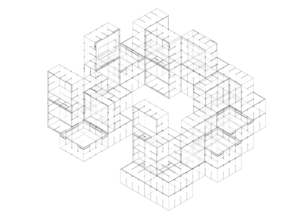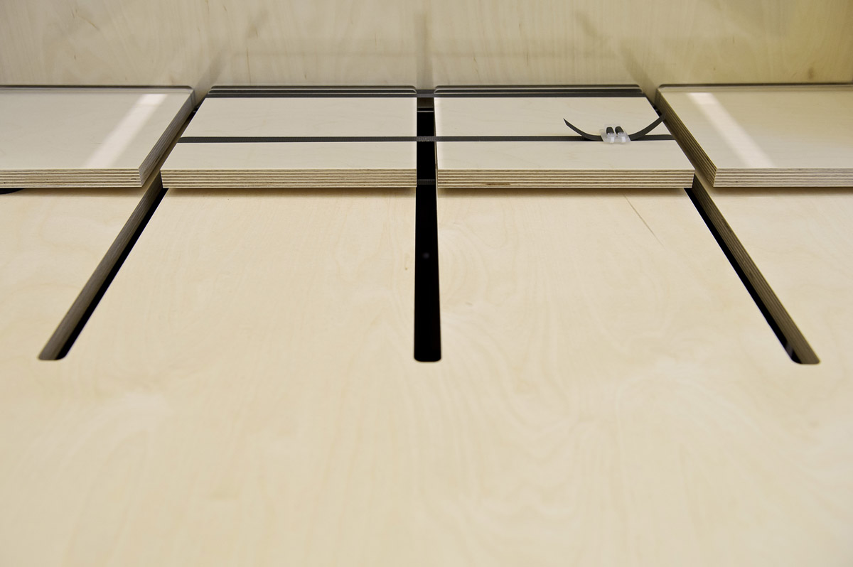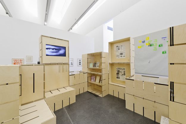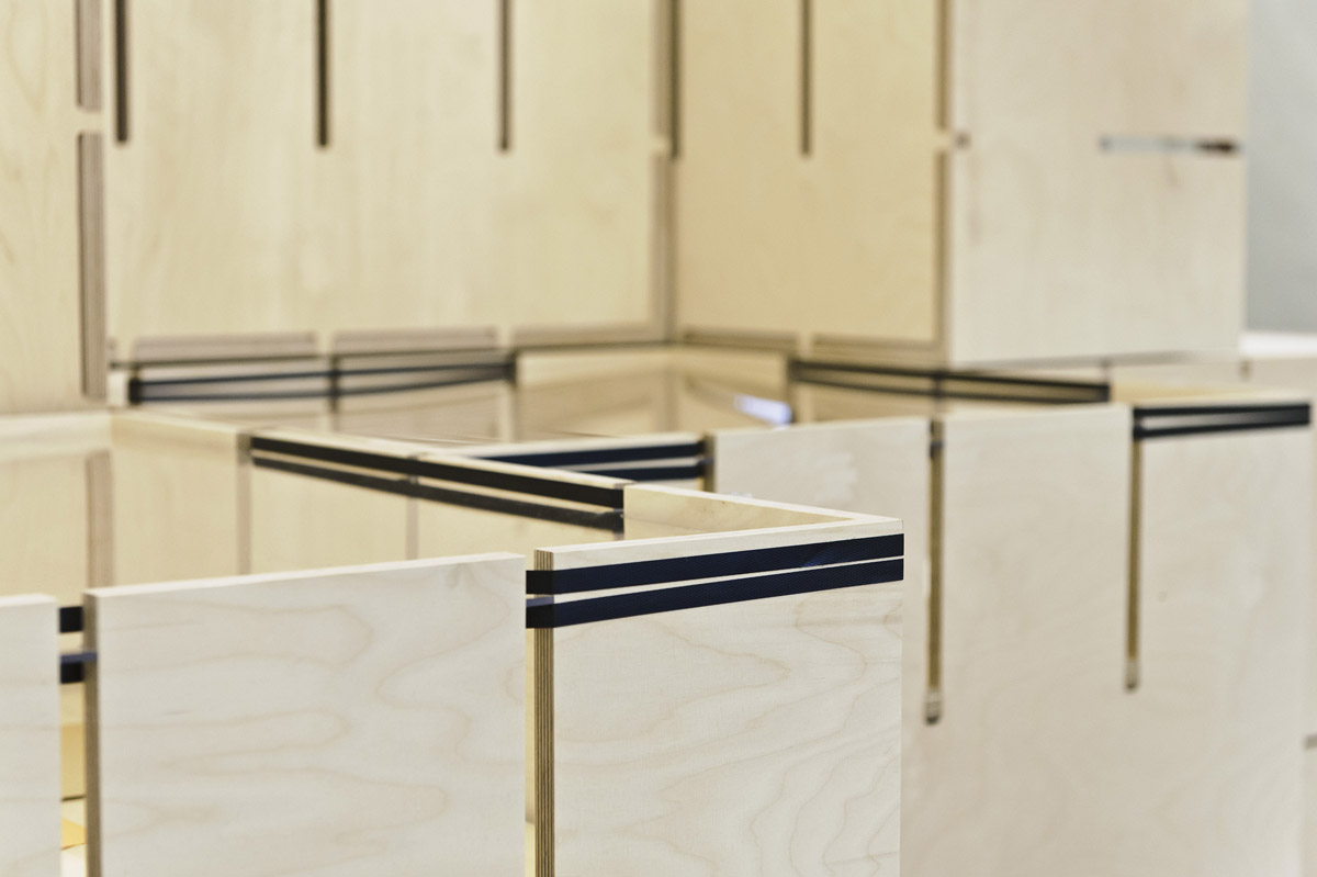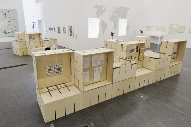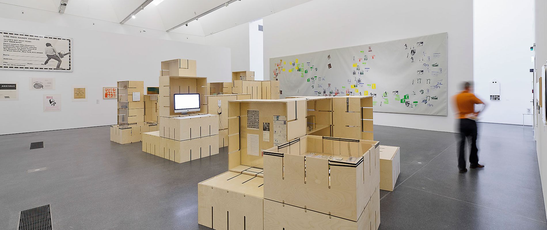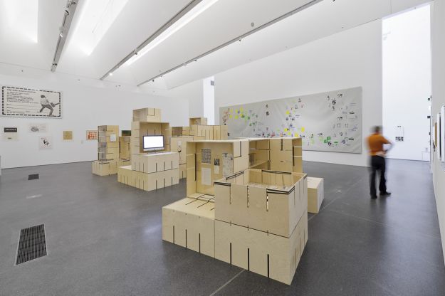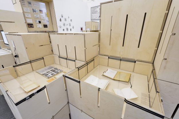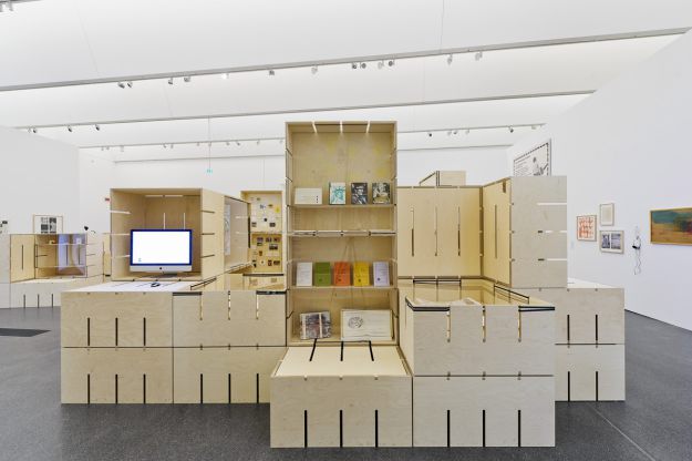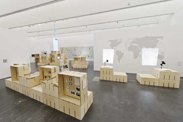 Für die Ausstellung „FLUXUS – Kunst für Alle!“ des Museums Ostwall im Dortmunder U wurde modulorbeat beauftragt eine Ausstellungsarchitektur zu entwerfen. Die Architektur arbeitet mit einem speziell für die Fluxus-Schau entwickelten Ausstellungsmodul aus Furniersperrholz, das auf vielfältige Weise spielerisch eingesetzt wird. Horizontal oder vertikal, als Regal, Vitrine oder Podest fügen sich die Module zu einer prägenden Raumstruktur im großen Oberlichtsaal des Dortmunder U. Mit Einsatzböden und -wänden, sowie Acrylglasscheiben werden die Grundrahmen für die jeweilige Nutzung ausgestattet. Die Fixierung dieser Ausstattungselemente sowie der Module untereinander erfolgt durch gewöhnliches Paket-Spannband.