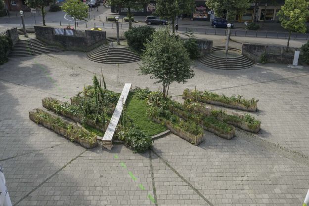 Das Atelier Le Balto entwickelte in einem einwöchigen Workshop eine temporäre Garteninterventionen auf dem Platz. Das ConstructLab baute in einem kooperativen Prozess Möbel.