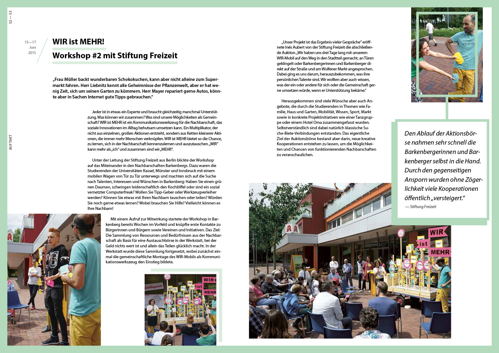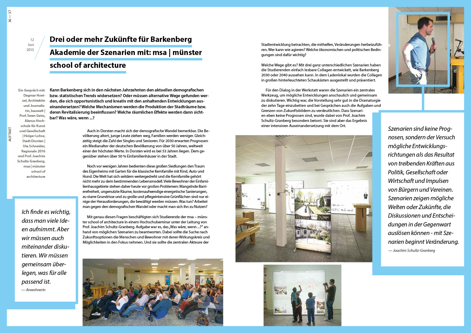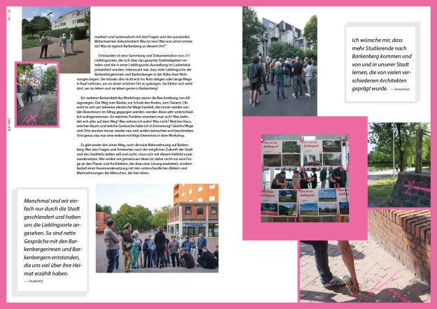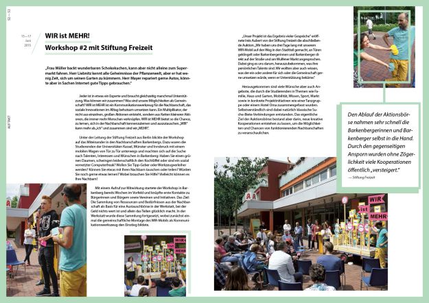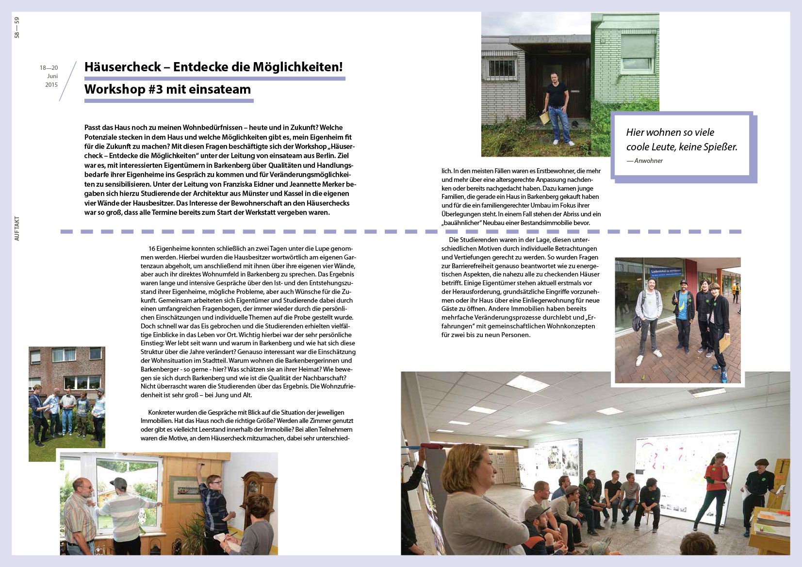 Die Werkstattreihe „HausAufgaben“ startete im Juni 2015 mit einer 10-tägigen Auftaktwerkstatt in Dorsten-Barkenberg für und mit Hauseigentümern, Bewohnern und allen Interessierten, die über die Zukunft ihrer Immobilie und der Einfamilienhausgebiete nachdenken und ins Gespräch kommen wollten. Ein leerstehendes Ladenlokal wurde zum temporären Ort intensiven Austauschs: Mit drei Workshops und einem begleitenden Rahmenprogramm machte sich die Werkstatt gemeinsam mit Zukunftsdenkern, Planungs-, Gestaltungs- und Finanzspezialisten sowie Studierenden auf die Suche nach Besonderheiten der Wohngebiete und des Ortes. Die positive Wahrnehmung des Ortes, unterschiedliche Entwicklungsszenarien mit Blick in die Zukunft sowie Ideen für neue Gemeinschaften standen dabei genauso im Mittelpunkt wie erfolgreiche Praxisbeispiele und konkrete Anregungen, um Einfamilienhäuser an aktuelle und zukünftige Wohnbedürfnisse anzupassen.