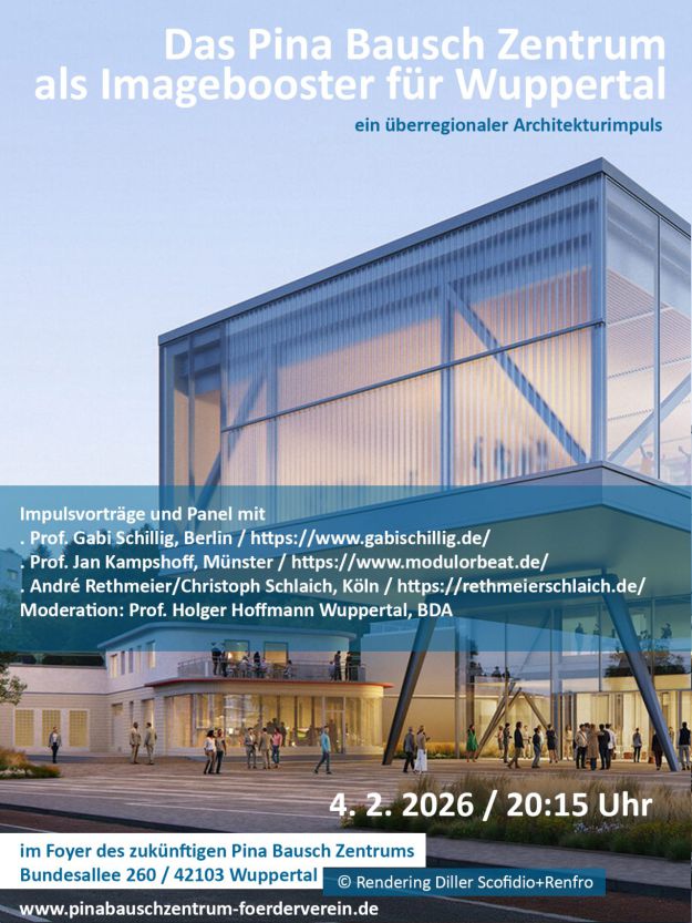 "Es wird weit mehr als ein Haus für die Kultur sein: der Siegerentwurf von Diller Scofidio + Renfro, einem der international renommiertesten Architekturbüros für hybride Kultur- und Stadträume, schafft ein Gebäude, das als aktiver Stadtbaustein die weitere Entwicklung Wuppertals unterstützen wird. Es verschränkt kulturelle Strahlkraft und öffentliche Nutzung ineinander: ein architektonisches Aushängeschild, das Wuppertal direkt bereichert und international sichtbar macht. Wir sprechen darüber mit Prof. Gabi Schillig, Berlin https://www.gabischillig.de Prof. Jan Kampshoff, Münster https://www.modulorbeat.de und André Rethmeier/Christoph Schlaich, Köln https://rethmeierschlaich.de am 04.02.26 in Wuppertal ! Moderiert wird der Abend von Prof. Holger Hoffmann, Wuppertal, BDA."