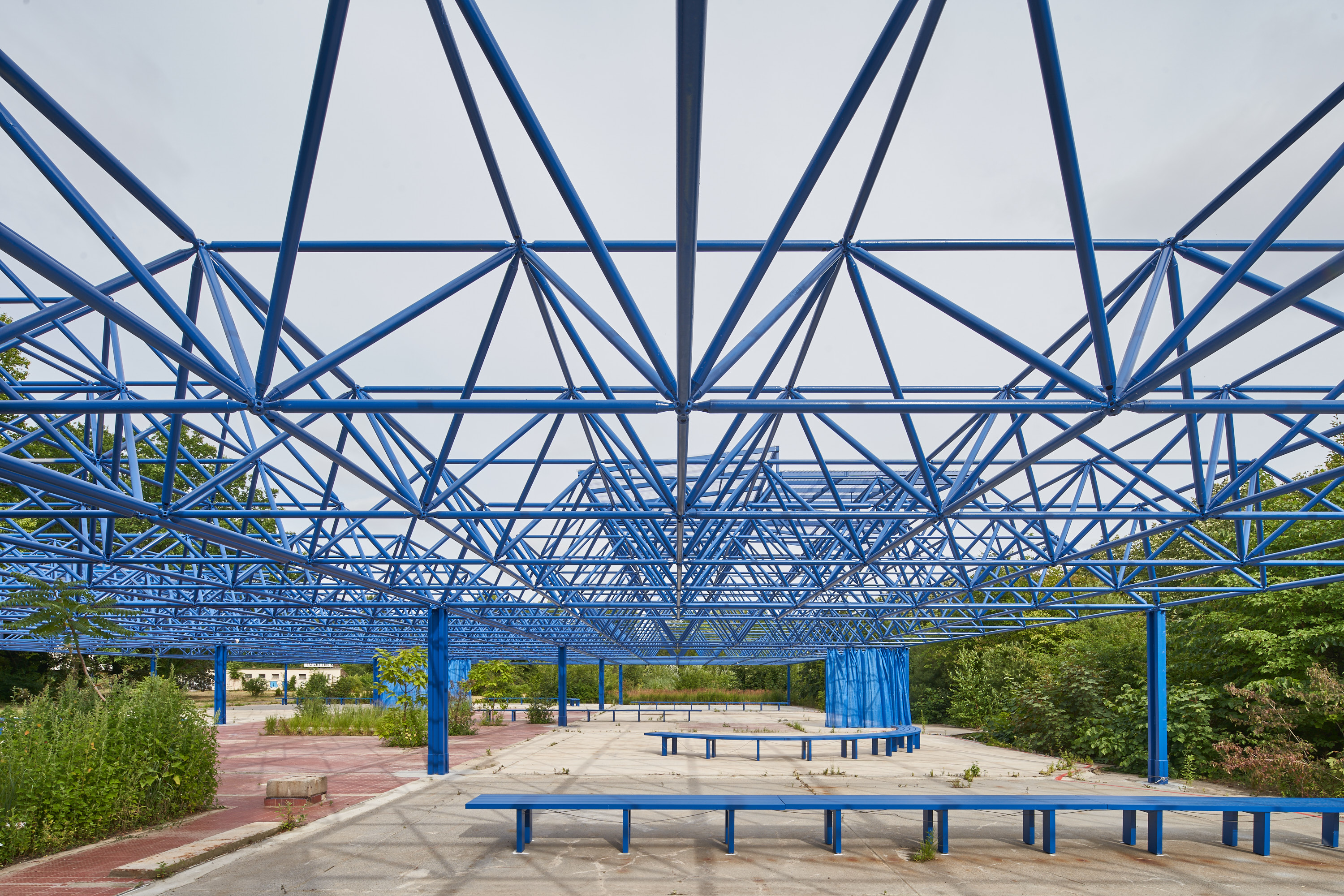 Der Entwurf nutzt den Bestand der Mero-Halle als Ausgangspunkt und Ressource für die Entwicklung eines neuen hybriden Ortes. Die bestehende Tragwerkskonstruktion mit den namengebenden MERO-Knoten wurde im Rahmen der Sicherungsmaßnahmen des Parks ertüchtigt und durch einen blauen Korrosionsschutz ergänzt: Ein leuchtendes Enzianblau, das als Farbe in der Natur kaum vorkommt. Die Struktur des Daches und seine Schattenwürfe wurden für die Transformation der Halle aufgegriffen und sind in den Elementen der Installation wieder zu finden. Bänke laden zum Verweilen, zum Zuschauen und -hören ein. Teilüberdachungen schützen vor Regen oder Hitze, verändern aber auch den Blick in den Himmel und spielen mit Licht und Schatten. Die Vorhangelemente, die wie ein Interieur einzelne Sektionen innerhalb der Halle bilden, thematisieren indes die Grenze zwischen Innen und Außen. Vorhandene Schächte und Perforationen in der bestehenden Bodenplatte nehmen Planzen auf und bilden einen Hybrid zwischen Struktur und Natur. Diese Interventionen schaffen einen räumlichen Rahmen, der unterschiedliche Programmnutzungen zulässt und im Dialog von Raum und Nutzung steht. Die „Blaue Stunde“ ist ein Potentialraum, der als Gastgeber fungiert und neue Formate der Begegnung ermöglicht. Die zunächst temporäre Installation wird nun nach einem erfolgreichen Testbetrieb zum dauerhaften Teil des neuen Spreeparks..