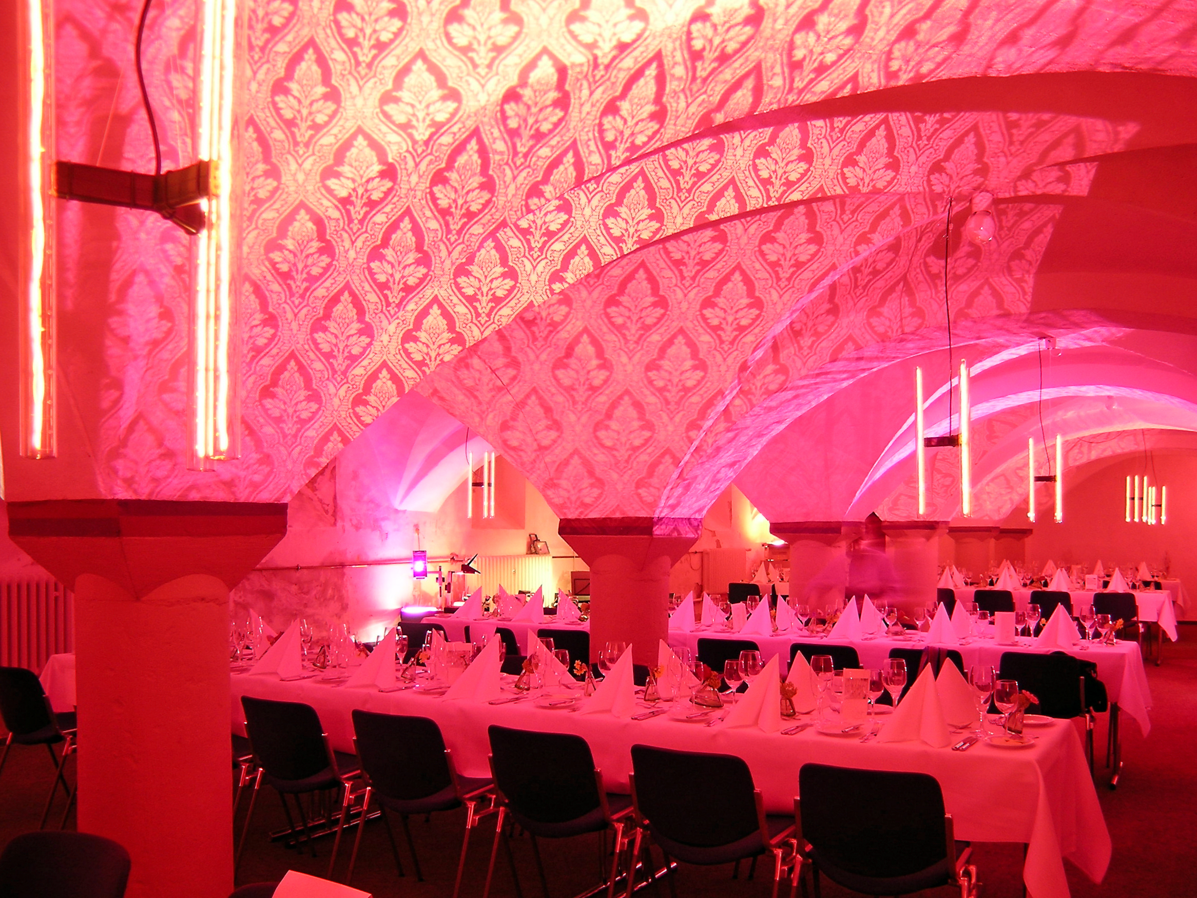 Für ein besonderes Dinner wurden die Gewölbe des Krameramtshauses in Münster mit einer temporären Rauminstallation bespielt. Projektionen und speziell entwickelte "Kerzenleuchter" aus Linestra-Glühlampen schaffen den atmosphärischen Rahmen für einen besonderen Event.