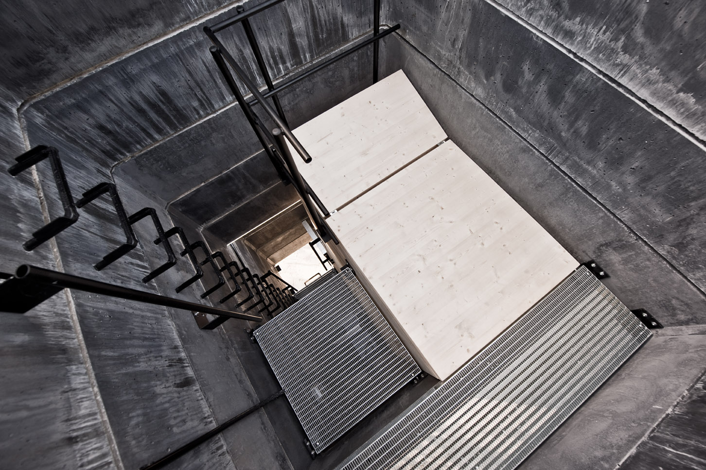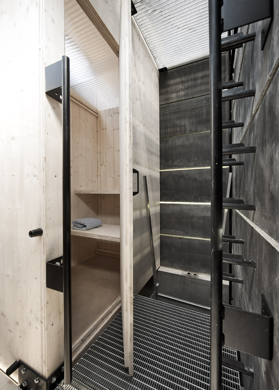 „Mit der One Man Sauna realisierte das Architekturkollektiv Modulorbeat eine temporäre Hommage an das Nichtstun. Die Beton-Skulptur ist 7,5 Meter hoch und besteht aus aufeinander gestapelten Betonfertigteilen, die eigentlich für den Bau von Schachtanlagen verwendet werden. Ganz unten ist das Tauchbecken, mittig findet sich die Sauna-Box und oben der Ruheraum mit freiem Blick in den Himmel. Mitten in Bochum auf einer Industriebrache schafft die voll funktionsfähige Sauna einen Ort, der Ruhe und zugleich Aktivität forciert und der im Rahmen des Detroit Projekts zum Nachdenken über die Zukunft von Arbeit und Stadt in einer Region ohne Wachstum anregt.“